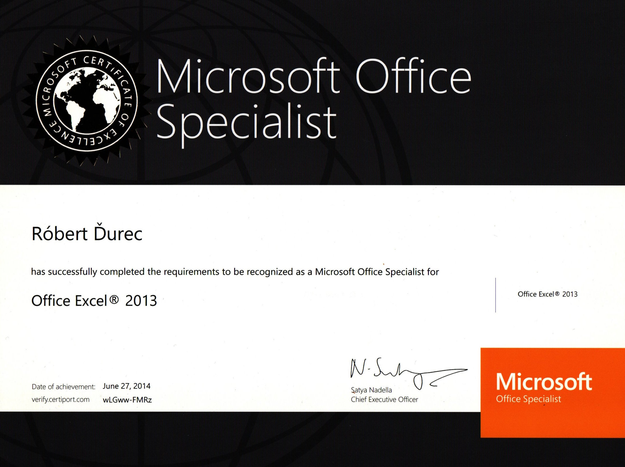 - 2014: Microsoft Office Specialist (MOS Certification) for Excel 2013 (View certification PDF, JPG)
